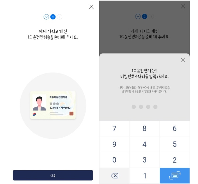 3. 관련약관 동의를 진행한 후, 발급받은 IC 운전면허증을 준비하고 수령 시 설정한 비밀번호 네자리를 입렵합니다.